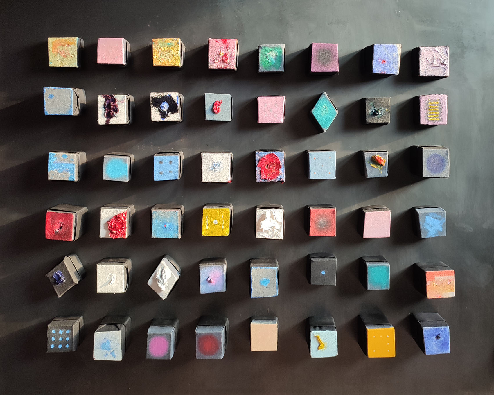 Doświadczenia z abstrakcją pozwoliły mi na zbliżenie się do cząstek obrazu i koloru. Chęć zbadania relacji i warunków zaistnienia synergii całości skierowało moje spojrzenie na najmniejszą składową percepcji. W przypadku tej serii obserwuję moment pojawiania się, zaistnienia faktu interakcji – z ciszą, tłem, pustką. 5×5 cm to Moment Badawczy obrazu, który porównuję do warunków percepcji dźwięku, tworząc obszar izolowany, dający wybrzmieć wartości pojedynczego tonu.